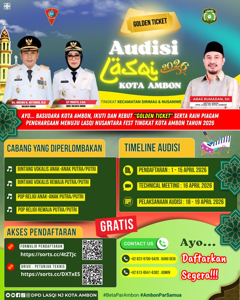 “LASQI Kota Ambon membuka audisi bagi anak-anak dan remaja yang memiliki bakat vokal untuk mengikuti seleksi pada cabang vokalis dan pop religi,” ujarnya, Senin (6/4/26) di Ambon.